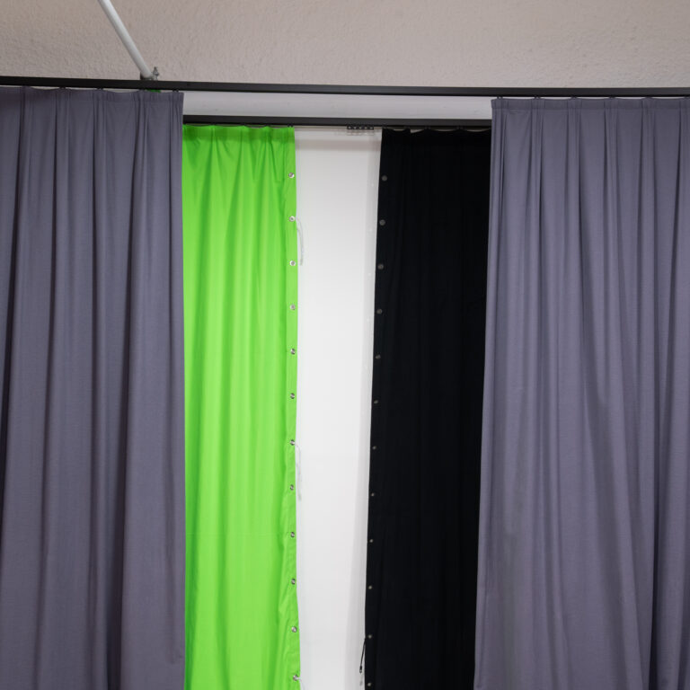 Über die ganze Hohlkehle: Schwarz, Dunkelgrau und Chroma Key Green. Super schnell wie einen Vorhang vorziehen. 10x4m